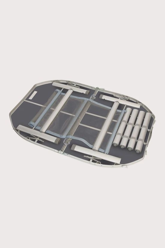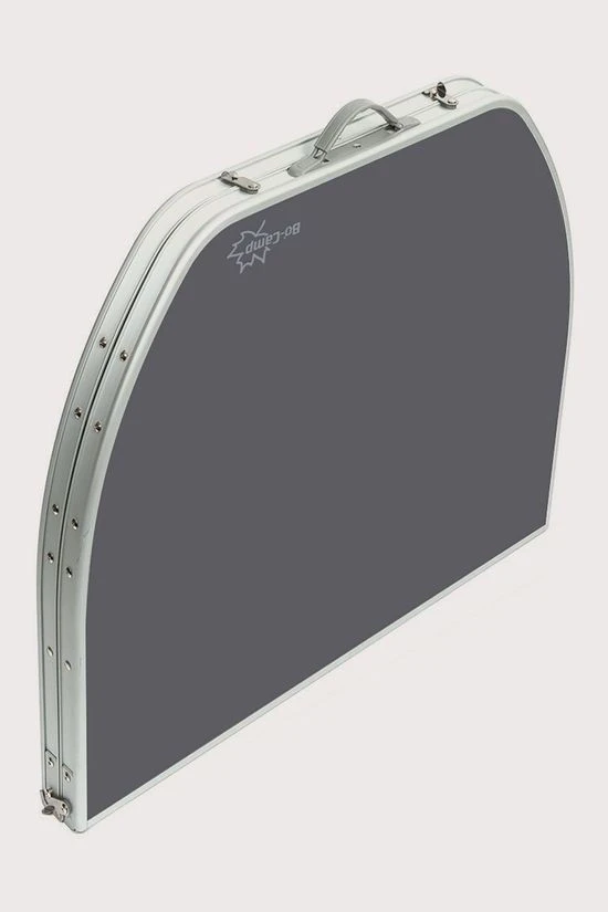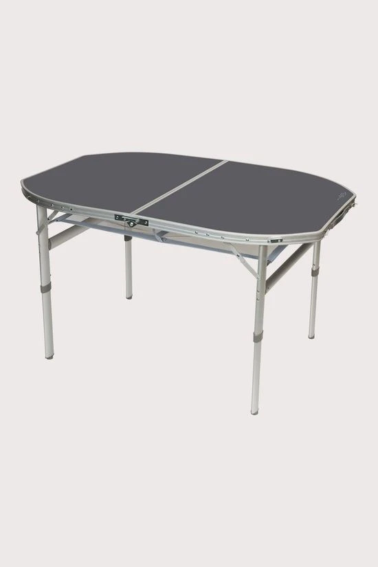 De Bo-Camp Tafel Ovaal Koffermodel 120×80 cm is een zeer stabiele ovalen campingtafel. Deze tafel heeft verstelbare poten, stelschroeven voor extra fijnstelling en een deelbaar tafelblad. Hierdoor is de tafel eenvoudig op te vouwen tot koffermodel (80 x 60 x 7 cm). De tafel is gemaakt van lichtgewicht aluminium. Onder het tafelblad is een net bevestigd om spullen op te bergen.