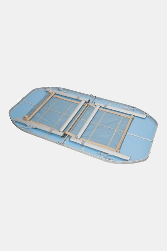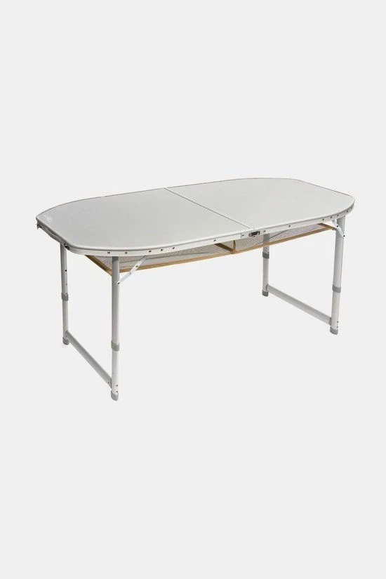 De Bo-Camp Tafel Premium Ovaal Koffermodel 150×80 cm is een zeer stabiele ovalen campingtafel met een watervast en hittebestendig tafelblad. Deze tafel heeft in drie hoogtes verstelbare poten (55, 65 en 70 cm), stelschroeven voor extra fijnstelling en een deelbaar tafelblad. Hierdoor is de tafel eenvoudig op te vouwen tot koffermodel (80 x 60 x 7 cm). Het is gemaakt van lichtgewicht aluminium met een watervast en hittebestendig tafelblad. Onder het tafelblad is een net bevestigd om spullen op te bergen.