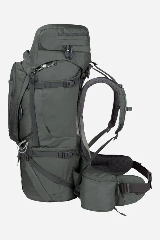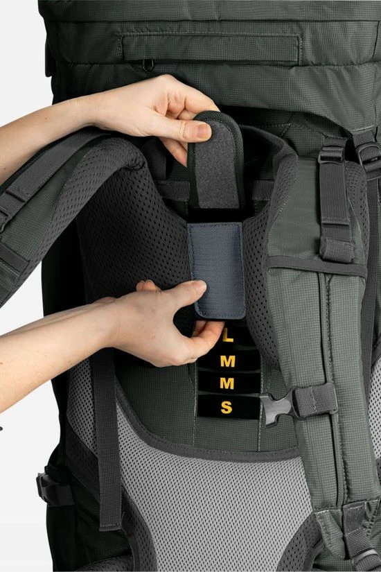 - Er past 65 liter in de rugzak plus nog 10 extra door middel van het klepvakje wat in hoogte te verstellen is, zodat je er nog meer spullen in kwijt kan.