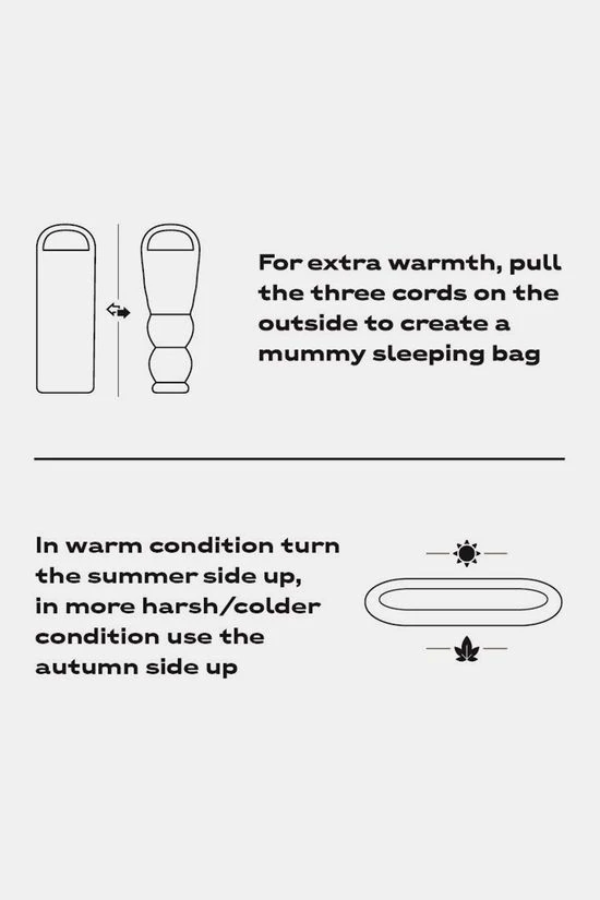 - Deze slaapzak verander je gemakkelijk van deken- naar mummyslaapzak met behulp van de koordjes aan de buitenkant en de slaapzak heeft een zomer én een herfstkant. Je hoeft ‘m dus alleen om te draaien om warmer of juist koeler te slapen.